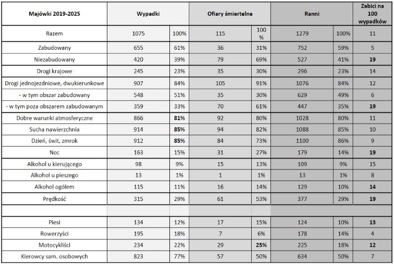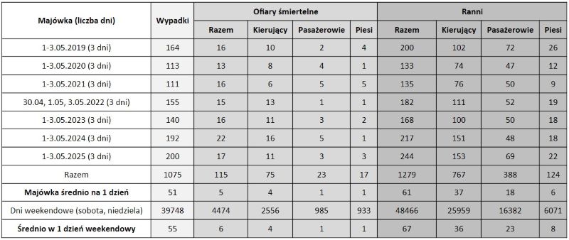 Jak wynika z zestawienia danych, w latach 2019-2025 w dniach 1-3 maja doszło łącznie do 1075 wypadków, w których zginęło 115 osób, a 1279 zostało rannych. Średnio daje to 51 wypadków dziennie, podczas gdy przeciętny dzień weekendowy w tym samym okresie to 55 wypadków.